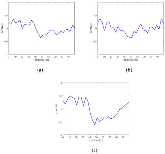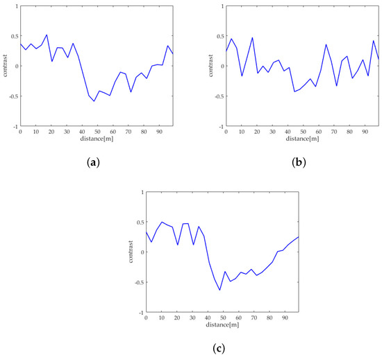 where represents the intensity of the yth pixel on the profile (where , Y is the total number of the pixels in the profile), and is the average intensity of the profile. The obtained contrasts corresponding to the profiles in Figure 12a–c are shown in Figure 13a–c, respectively.