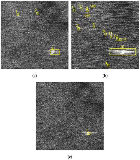 In this subsection, a comparison of the ship detection results of sub-block C will be analyzed. In this paper, we adopted the traditional two-parameter CFAR detection method [27] to detect ships in the images of sub-block C. The corresponding detection results of Figure 8a,b and Figure 10d are shown in Figure 14a–c.