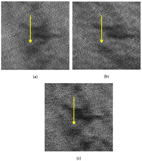 For better comparison, we delineated the profiles of the oil spills in the VV and HH polarized images of sub-block B as well as the one after sea spike suppression. Figure 12a–c depict the profiles on the images originated from Figure 7a,b and Figure 10c, respectively. Calculating the contrast of profiles shown along the yellow arrows in Figure 12a–c, the equation is expressed as