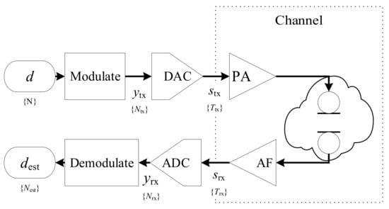 - Proakis, J.G.; Salehi, M. Elements of a Digital Communication System. In Digital Communications; Chapter 1.1; McGraw Hill: New York, NY, USA, 2008; p. 2. [Google Scholar]