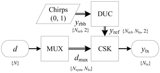 For a fixed transmission channel communication, the up-conversion through a DUC can be omitted and the reference chirps directly be calculated in the transmission band, but for the sake of flexibility, we added the up-conversion as a separate block. The resulting single chirp sequences for all transmission channels can be stored permanently and only requires to be recalculated, if the parameters, e.g., sampling frequency , chirp length , side-band center frequency or bandwidth B change. While intuitively both chirp slope sequences may be pre-generated, we omit this redundancy on implementation as the inverse slope sign is equivalent to a time reversal of the entire chirp sequence.