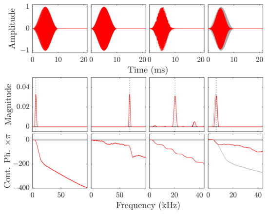 The amplitude shape of the chirp can thus be adapted to the channel, depending on the application, i.e., if a narrow autocorrelation peak width is required for spatial distinction of two close reverberations or wide smooth peaks are desired for more robust communication. The implementation we used in this work is described in Algorithm A2. A simplified comparison of a selection of window functions for a close echo is shown in Figure 4 and Figure 5.