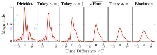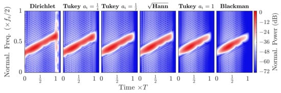 Simulated spectrograms of the autocorrelations of a selection of shaping window functions. All magnitudes are normalized by the Dirichlet shaped chirp power for comparison. Gaussian noise was added to a signal-to-noise ratio of 0 , as well as two echoes at and .
