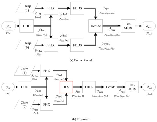 Comparison of the conventional and proposed demodulation as a block diagram in detail. (a) In the former case, the received sequence yrx is processed by Digital Down-Coverter (DDC), compressed through a Fast Hilbert Cross-Correlator (FHX), converted into symbol space through Frame Detect & Downsample (FDDS), which is interpreted by a binary decision (Decide) block, and finally assembled into the estimated data output dest through a reverting multiplexer (De-MUX). (b) We propose the insertion of a superposition in the compressed sample space through the Join & Downsample (JDS) block that creates a sum signal for symbol timing and a difference signal for symbol extraction.