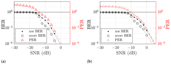 This operation requires coherence, since a phase difference between the up and down chirp compressed sequences leads to sub-optimal symbol detection. This condition will be fulfilled only if no Doppler shift is present, so sender and receiver do not move relative to each other [50]. For this work, we exclusively considered stationary conditions. The sum and difference sequences are stored in a joint array of size .
