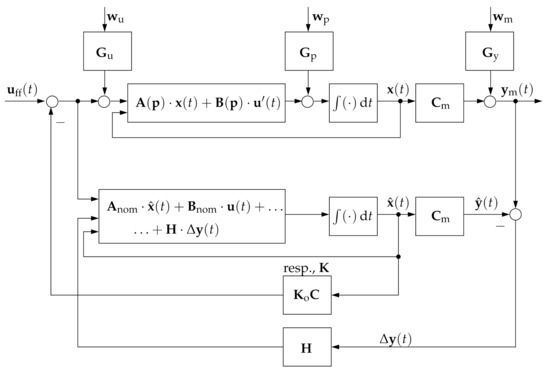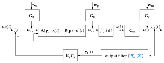 Theorem 3. (Optimal control and filter gains) The controller and filter gains from Corollary 1 in Section 2.2 and Corollary 2 in Section 2.3 are jointly optimal if they are chosen so that the cost functionis minimized, where the abbreviation is defined and is a free matrix variable. Here, the matrices are defined for the vertices of the polytope (10) according towith In addition, the definiteness constraintwithandmust be satisfied; symbols indicate an iterative evaluation, where all such values are replaced by the outcome of the previous iteration stage. Proof. Define a positive definite Lyapunov function candidate