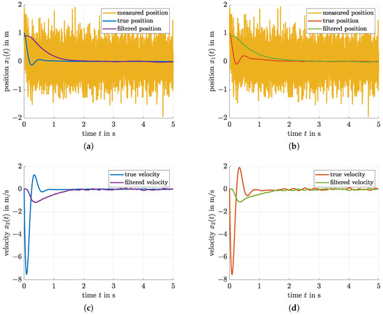 for the model-free filter technique that was optimized by means of the proposed LMI-based procedure. On the one hand, it can be seen that the resulting parameterization is capable of effectively suppressing the stochastic measurement noise. However, in contrast to the observer discussed in the following subsection, the price to pay for this noise suppression is a non-negligible delay in the reconstruction of both