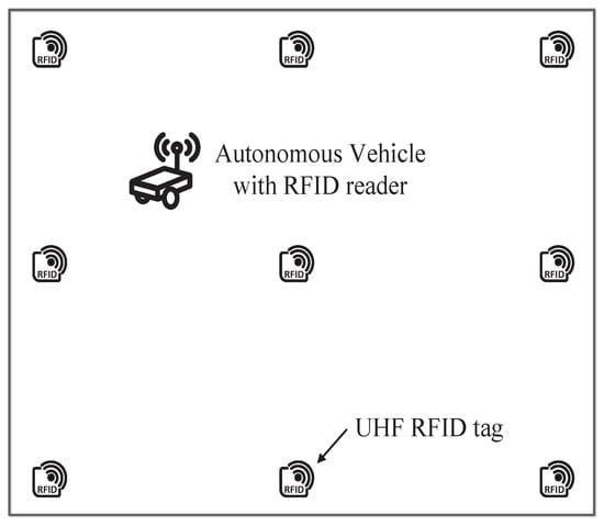 To locate and track the autonomous vehicle in an indoor environment, a UHF RFID reader was deployed on the vehicle, and UHF RFID tags were placed on the floor, as shown in Figure 1. There were N tags whose coordinates were known. After querying the tags, the reader can obtain the electronic product code (EPC) codes of the tags and extract the phase of the backscatter signal.