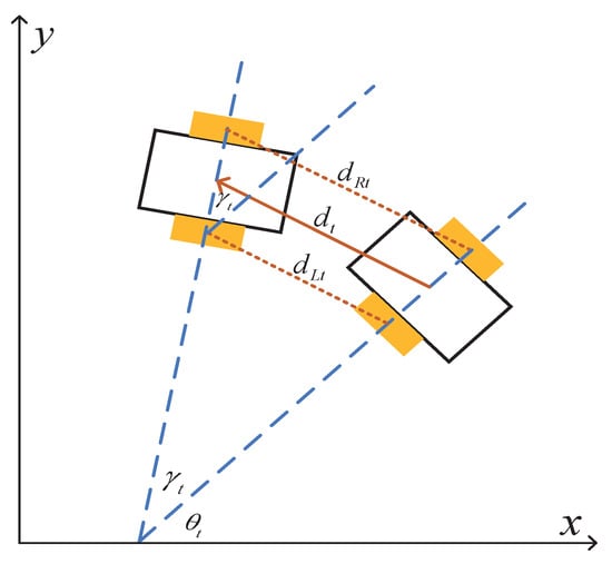 The trajectory of the autonomous vehicle was controlled by the left and right wheels. Wheel encoders were installed on each wheel, which recorded the distance traveled by each wheel. This vehicle motion problem was modeled as a state transition model in the paper. Suppose the position of autonomous vehicle at time t is and the orientation is . Let and denote the incremental distance of the left and right wheels, respectively. Thus, as shown in Figure 2, the state transition of the vehicle from time t to is given by: