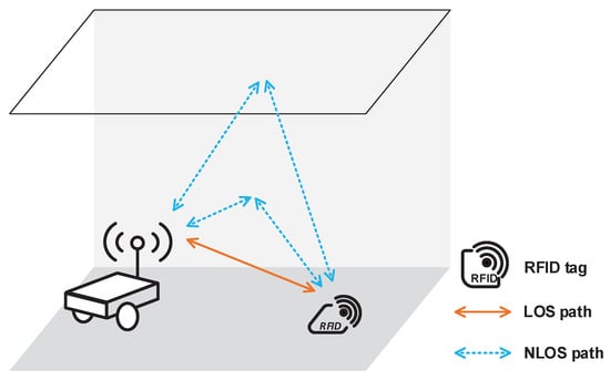 In recent years, many RFID-based indoor robot localization systems have been studied [10]. Early works used RFID tags as landmarks, which requires a dense tag deployment to guarantee the position accuracy. Most of these methods actually do not use any feature of the backscatter signal and just use RFID tags as landmarks. In [11], the mobile robot carried a reader antenna on the bottom, and the position could be estimated through the position data of the tags within the recognition area of the reader. Considering the effect of RFID reading fault, an effective fault-tolerant RFID reader localization approach was studied in [12]. Similarly, some autonomous mobile navigation systems based on high-frequency (HF) passive RFID were studied in [13,14,15]. The relationship between the density of the RFID tag distribution and localization precision was analyzed in [16]. In another work, the tags were used to define the desired trajectory of the robot [17]. Subsequently, the received signal strength (RSS) measurement of the backscatter signal was utilized to estimate the position of mobile robots. Using path loss model, the distance between the tag and reader was obtained. The position was estimated by a probabilistic [18,19] method or a geometric method [20]. Thereafter, sensors, such as ultrasonic sensors [21] and odometry sensors [22], were fused with the RFID localization system to reduce the uncertainties. Filter-based algorithms, such as the Kalman filter (KF) [23,24] and the particle filter (PF), are the most popular fusion methods. In [25,26,27], the phase of the backscatter signals was fused with the odometry information, which was obtained from the encoders on the wheels of the vehicle. Moreover, the phase shift of the backscatter signals was used for robot localization [28,29]. A data-driven fusion estimation method based on the unscented Kalman filter (UKF) was given in [30]. Furthermore, a particle filter can also be used as a fusion method [31]. Different from these two types of famous filtering methods, a new extended finite impulse response (EFIR) filter was proposed for RFID-based mobile robot localization and navigation [32,33]. For indoor robot localization methods, which use UHF RFID tags, the performances of different filters were studied in [34]. What is more, the effect of infrastructure and localization algorithms on position accuracy, in RFID-based robot location systems, was investigated in [35]. In [36], a particle filter was employed to use the phase difference between two steps of the mobile robot for localization and tracking. This method is similar to the landmark-based method and requires a high density of tags. Furthermore, extending the problem to three dimensions, the indoor unmanned aerial vehicles localization and tracking problem was studied in [37,38].