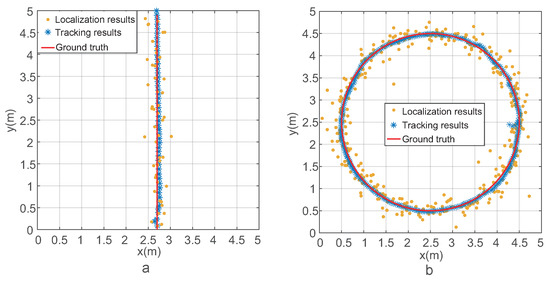 To test the tracking algorithm, two trajectories were designed. As shown in Figure 5a,b, one was a straight line, and the other was a circle. The red lines in these two sub-figures are the ground truth of the trajectories. The yellow point is the localization result of the PDOA RFID localization algorithm. Furthermore, the blue asterisks are the results of the tracking algorithm at each step. The movement step was set to be 0.1 m in the straight line trajectory and 0.035 m in the circle trajectory. In these two experiments, it was assumed that the reader could read four neighboring tags. Thus, the localization result was calculated by using the four ranging results. It can be seen that the RFID localization results had obvious errors. For the straight line trajectory and the circle trajectory, the mean localization errors were 0.201 m and 0.196 m. The RFID localization error was caused by the ranging error, which was caused by the multipath propagation of the wireless signal and phase noise. Using the proposed Kalman filter-based tracking algorithm, the tracking errors were 0.116 m and 0.053 m for the straight line trajectory and the circle trajectory, which were 42.3% and 73.0% lower than the localization errors. The reason why the tracking error of the the straight line trajectory was bigger than the circle trajectory was that the movement step of the former was bigger than the latter. It can be seen from Figure 5 that the tracking results, which are blue asterisks, had sufficient accuracy for robot tracking in a warehouse.
