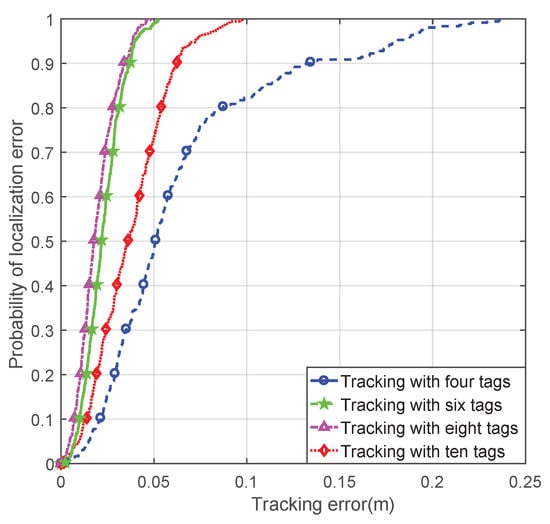 Another experiment was performed to find the relationship between the number of tags used for localization and the accuracy of the tracking. The straight and circular trajectories were both utilized in this experiment. The experimental environment setting was identical to the previous experiment. The only parameter that was different was the number of tags used for localization, which was set to be four, six, eight, and ten in the experiment. The mean error and RMSE of localization and tracking with different numbers of tags are shown in Table 1. The mean localization errors for these two trajectories using different numbers of tags were similar, which proved the robustness of the proposed channel model and localization algorithm. The cumulative distribution function (CDF) curves of the circle trajectory tracking error with different numbers of tags are shown in Figure 6. The 80% probability tracking error of four, six, eight, and ten tags was 0.026 m, 0.029 m, 0.053 m, and 0.088 m, respectively. It can be seen from Table 1 and Figure 6 that when the number of tags changed from four to eight, the localization and tracking errors reduced. However, when the number of tags was ten, the error increased. This was caused by the increasing localization error. When ten tags were used for localization, the tags at a long distance caused a big ranging error, which made the localization error increase.