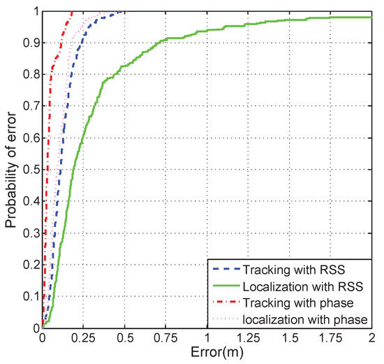 In order to compare the proposed method with previous works, we designed an experiment to evaluate the localization accuracy and tracking accuracy. Although there are some phase-based autonomous vehicle tracking methods, they require a high-density tag deployment environment to work. Hence, the proposed method was compared with the well-known RSSI ranging method [41], where the RSS of the backscatter signal is employed to estimate the distance between the tag and reader. In this experiment, the autonomous vehicle was moving on the circular trajectory. The number of tags that were utilized to estimate the position of the autonomous vehicle was four. The localization error and tracking error were calculated with Equations (26) and (27). The CDF curves of tracking and localization error with RSS and phase are shown in Figure 7. The 80% probability RSSI-based localization error, RSSI-based tracking error, phase-based localization error, and phase-based tracking error were 0.42 m, 0.18 m, 0.16 m, and 0.088 m, respectively. It can be seen that the error of the RSSI-based localization is much higher than the phase-based localization. Hence, the track accuracy of the proposed phase-based method was higher than the traditional RSSI-based method. This was caused by the RSSI-based ranging method having a poor performance in the multipath environment. The small-scale fading made the ranging result have a big error. Even though the multipath signal propagation also had impacts on the signal phase, the proposed PDOA-based tracking method had a higher accuracy.
