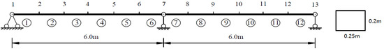 This section studies the model updating of a two-span beam. The length of span and the section of the beam are drawn in Figure 2. The FE model of the simulated continuous beam is composed of 12 identical Euler–Bernoulli beam elements. Every node in element contains two degrees of freedom, a vertical displacement and a rotation angle. For the initial beam model, it is assumed that the elastic modulus and density are 2.8 × l010 Pa and 2.5 × l03 kg/m3, respectively.