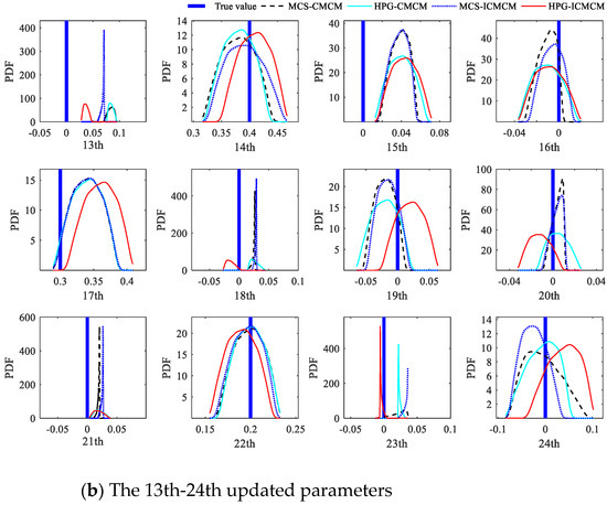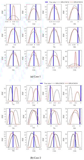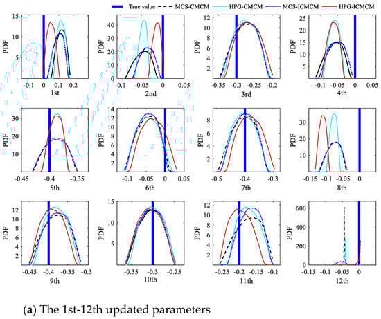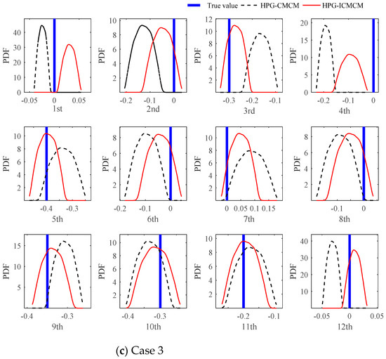 The proposed HPG-ICMCM method and the HPG-CMCM method are performed to update the continuous beam in the three cases and obtain the PDFs of the updated parameters, which are the elastic moduli of the 12 elements, as shown in Figure 5. It is found from Figure 5a that when the ranks of the submatrix and that of are full and identical, the PDFs of the updated parameters by the two methods agree with each other very well, and they are very close to the true values of the updated parameters. Furthermore, it can be observed from Figure 5b,c that as the number of measurement modes decreases, the results from the HPG-CMCM method become worse. However, the proposed HPG-ICMCM method still has very good updating effectiveness. The reason why this phenomenon occurs comes from the increment of the dimension of updating equations, which leads to the full rank of the submatrix .