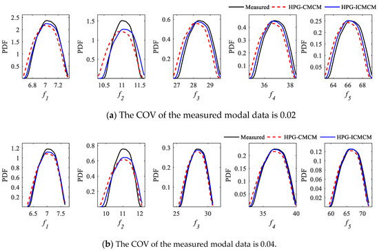 If one increases the COV of the measured modal data from 0.02 to 0.04, the PDF curves of the first five updated frequencies can also be obtained by the HPG-ICMCM method and the HPG-CMCM method, which are plotted in Figure 4b. From Figure 4b, it can be observed that even if the COV of the measured modal data increases to 0.04, and the measurement data have a relatively large fluctuation, the PDF curves of the updated frequencies by the two methods are still close to those measured frequencies. This finding shows that the proposed updating method can effectively deal with large uncertainty in measured data. On the other hand, the computational time of the proposed method is 12 s on a personal computer of Dell Inspiron 7391 with an Intel core I7-10510U CPU and a 8 GB memory, whereas the computational time of the MCS-ICMCM method and the MCS-CMCM method based on 1 × 106 samples is more than 1800 s, which shows that the proposed method is of high efficiency.