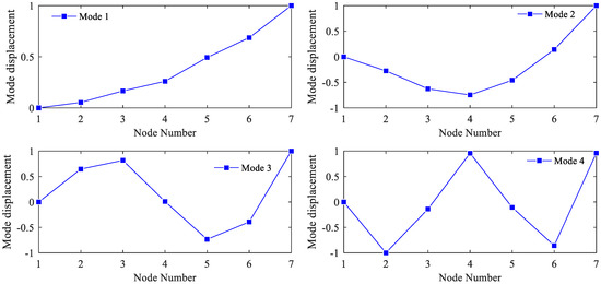 After the acceleration histories at the six measurement points were recorded, the Enhanced Frequency Domain Decomposition modal identification technique [31] was used to identify the modal data of the experimental beam. The mean values of the first four measured frequencies were 8.25, 52.56, 141.90 and 279.49 Hz, respectively. The means of the first four modal shapes are shown in Figure 7. After being expanded, the first three measured displacement modal shapes and their corresponding measurement frequencies were used for updating. Meanwhile, the first three simulated modal shapes and frequencies of the initial model were also selected. In the process of updating the model, the elastic moduli and mass values of the 6 elements were chosen as updated parameters.