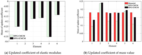 The proposed HPG-ICMCM method and the HPG-CMCM method were used for the model updating of the beam. The means of updated coefficients of the 12 updated parameters, including 6 elastic moduli and 6 mass values, are plotted in Figure 8. It can be seen from Figure 8a that the means of updated coefficients of 6 elastic moduli by the proposed HPG-ICMCM method are in a very good agreement with those of the HPG-CMCM method. The means of updated coefficients of the 6 elastic moduli are negative, which means that the elastic moduli of the experimental beam are less than those of the initial model. It is also found that the mean of updated coefficient at the cut kerf reaches −0.35, and it is obviously less than the values at other positions of the beam, which indicates that the degradation of stiffness of the 5th element occurs due to the cut kerf. In addition, from Figure 8b, it is seen that for the mean values of mass of the six elements, the results at 1st, 3rd, 4th and 6th element from the proposed method are better than that by the HPG-CMCM method compared with the measured mass values.