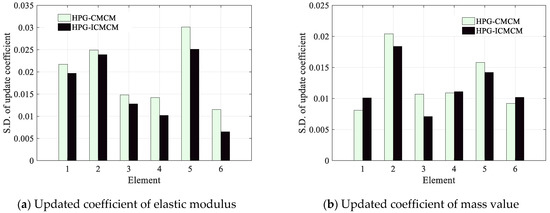 The standard deviations of updated coefficients of the 12 updated parameters, including 6 elastic moduli and 6 mass values, are plotted in Figure 9. It can be seen from Figure 9 that as a whole, the standard deviations of updated coefficients of the 12 updated parameters by the proposed method are less that those by the HPG-CMCM method. It can be derived that the COVs of updated coefficients of the 12 updated parameters are about 0.1, and actually the COVs of the measured frequencies are only 0.01 or so, which are obviously less than that of the updated parameters. This finding indicates that the small uncertainty of measured frequencies will cause a large fluctuation of the updated coefficients and the fluctuation of updated coefficients caused by the HPG-ICMCM method is less than that by the HPG-CMCM method.