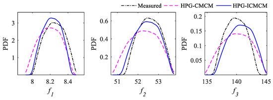 To further testify the updating effectiveness of the proposed method, the PDFs of updated frequencies of the experimental beam were simulated by using the 12 updated parameters, and the results are drawn in Figure 10. It can be found that the PDF curves of the HPG-ICMCM method are in a very good agreement with those of the measured frequencies, the PDF curves of the updated frequencies calculated by the proposed HPG-ICMCM method are closer to the PDF curves of the measured frequencies than those by the HPG-CMCM method.
