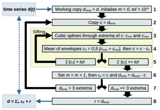 - Copy time series , initialize mode index () and choose a sifting tolerance (e.g., ).