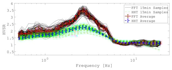 Results are somewhat different, with the FFT-based method estimating more details (even though smoothing according to [38] applies) than the MEMD results (which are not smoothed). Confidence estimates appear similar (judging from standard deviation) but estimates are not overlapping, suggesting considerable disagreement between the methods’ results with regard to the shape of the HVSR curve. Nevertheless, both methods agree very well with the peak frequency at around , albeit the FFT results in a larger peak amplitude.