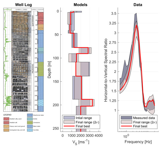However, it is difficult to compare two processing algorithms with real data, because the true result is generally not known. In order to avoid both, constructing unrealistic synthetic data and comparing different results of real data not knowing which one is true, we opt to use real data and go one step further by inverting the processing results. The inverted models can be more easily compared. While this strategy adds more unknowns to the comparison, it allows us to make use of existing complementary data such as well-logs and Vs models from other sources with which we can corroborate the inverted models obtained from the processing results of each processing method. Specifically, in the following examples, we will assign shear wave velocity ranges taken from existing studies to concrete layers identified from well-log lithology to generate a large number of reasonable starting models. Using the starting models, the inversion results for both algorithms’ HVSR data are compared based on the achieved , model confidence and the models’ ability to represent the known lithology qualitatively.