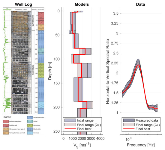 ICJA is a permanently installed Trillium 120 broad band seismometer [31]. It is installed in the basement of the Geoscience Barcelona (GEO3BCN-CSIC) building situated in the university district in Barcelona, Spain, a dense and busy urban environment [32,33]. Reports on the site’s Vs structure [34] and a well-log with a lithologic column are available [35]. Table 1 summarizes the well-log lithology into 11 layers and displays the starting model parameter ranges for the inversions that we will describe later. The starting model parameter range has been determined based on expected values for the given lithologic units, and only the sedimentary units, i.e., silty sand and clayey sand, have been given unusually large values because [34] report Vs velocities of around at these depths. During the inversions, Vs values are allowed to range from to for all layers.