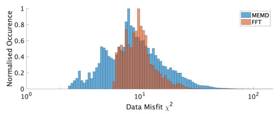 For the EJDN data inversion, we used every third datum point for a total of 19 datum points. The 80 inversions have been run for FFT- and MEMD-based HVSR estimates with 80 random starting models bounded by the initial parameter ranges given in Table 2. More than 350,000 models were evaluated for each algorithm and all models contribute to the final statistics. The weighted distribution of is illustrated in Figure 7.