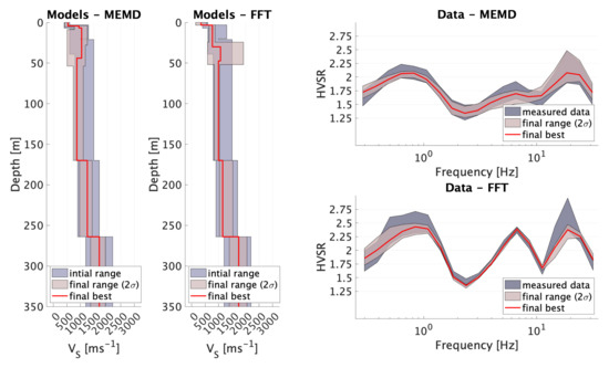 We invert our HVSR processing results with the computer code by [39] following the Diffuse Field Assumption [40,41]. The used code has been slightly modified to invert for the logarithmic HVSR and to use the corresponding covariance matrix. We only use every second data point, a total of 22 data points per method, in order to aid the inversion with faster convergence. A total of 350 inversions have been run for each, the FFT- and MEMD-based, HVSR estimates with 350 random starting models bounded by the initial parameter ranges given in Table 1, where each starting model was used once for both methods. During the inversion, model parameters had to remain within bounds between 50 and . The inversions evaluated more than 150,000 models for each algorithm and all models contribute to the final statistics.