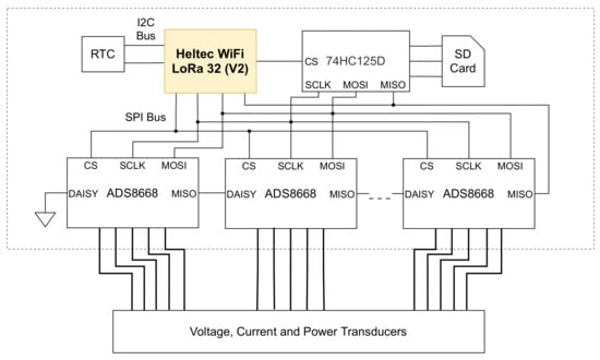 The PV generation data logger is responsible for monitoring the direct current (DC) voltage and current of multiple PV strings and active alternating current (AC) power at the inverter output. To achieve this, six ADC ADS8668 [