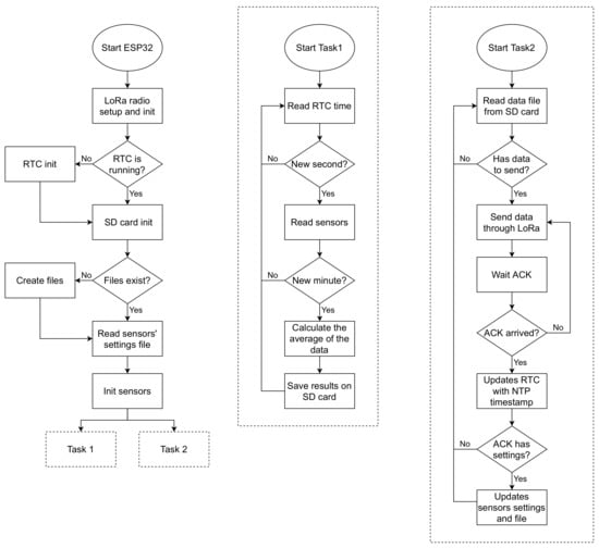 The first task is responsible for reading the sensors’ data. It contains a loop that performs polling of the time marked by the RTC. If the time obtained second value is different from the last sampling second value, a new sampling is performed, and each of the obtained data is added to the value stored in its respective variable. When the second equals 00, the values accumulated in the variables are divided by the number of samples, averaging the last-minute data (60 samples). This approach is based on [