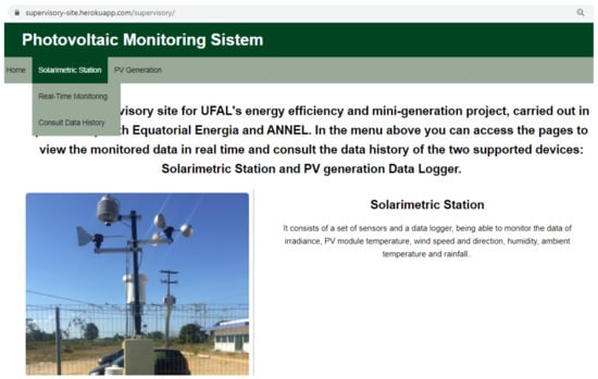 Figure 1 shows an overview of the system. The data logger devices are responsible for collecting, conditioning, storing, and transmitting data from all sensors. We developed two different devices. The first one is responsible for collecting the meteorological data from the solarimetric station sensors. The second one is a data logger to monitor the PV generation.