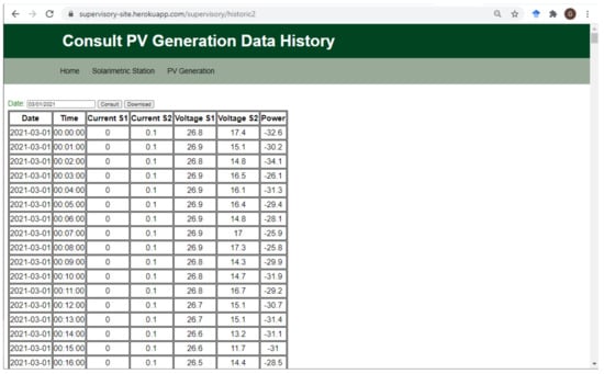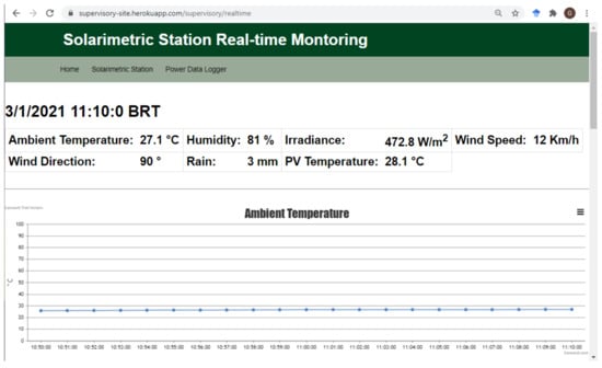 The architecture of the proposed system has good reliability and was effective in displaying collected data in real-time. During the 16-day experimental period, 23,040 data sets from each data logger were expected to be collected and sent. A total of 99.13% of the data sets from the solarimetric station, and 99.40% of the PV generation data sets, reached the cloud, demonstrating the system’s reliability.