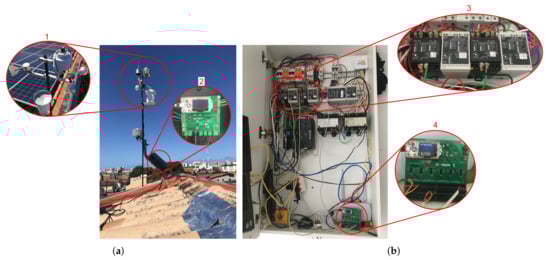 Figure 10b is located next to the inverter and has devices for protection and sectioning of the PV plant. Highlight 3 shows the DC voltage transducers (white) and DC current (black). Next to them is the AC power transducer. As detailed in