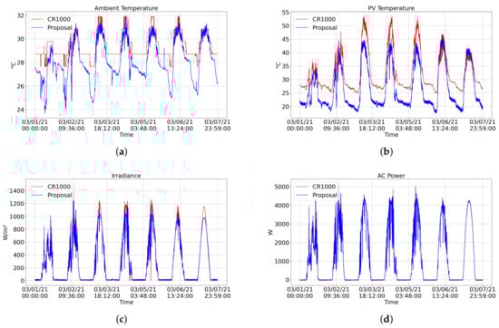 Figure 10a). In contrast, the pyranometer of the CR1000 system is installed at a lower level, next to the PV modules. Furthermore, the irradiance signal of the proposed system also presents noise. The application of a filter can reduce this noise and the error.