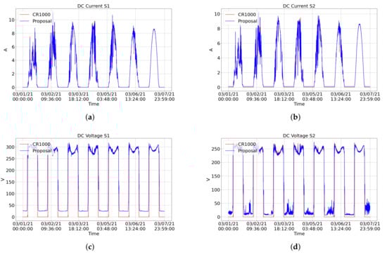 Before performing the comparisons and statistical calculations, a preprocessing of the data was performed. Regarding the data obtained by the proposed system, some of the PV generation values had errors in their measurements (e.g., being outside the expected range). The last valid reading replaced these values. Some current data obtained by CR1000 showed the not-a-number (NAN) value. These values were also removed and replaced by the last valid read value.