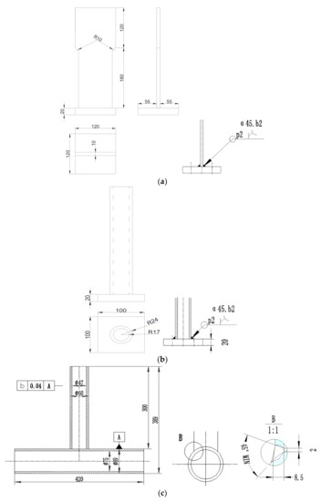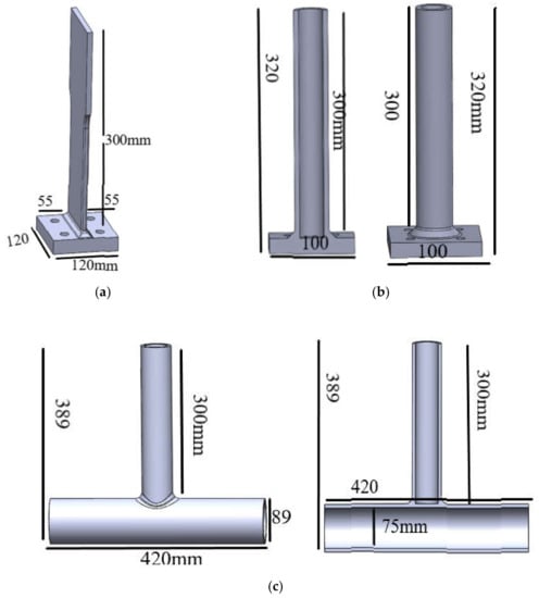 Geometry of the three types of specimens used in laboratory measurements. (a) T-type plate joint. (b) T-type tube-plate joint. (c) T-type tube joint.