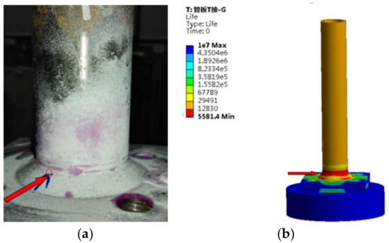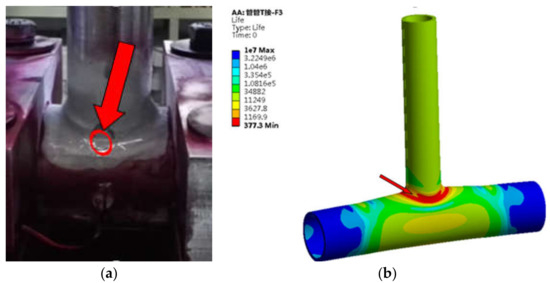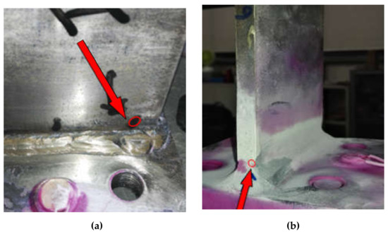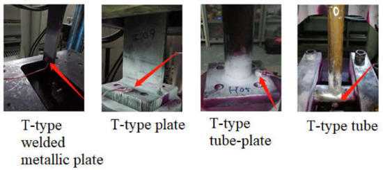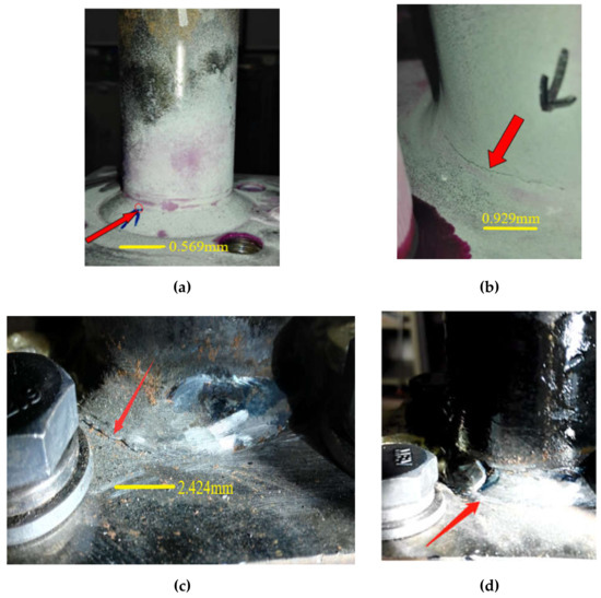 In order to reduce the error, the average fatigue life is selected as the test results in this paper. The available fatigue life of T-type tube-plate joint is 11,856 times. The fatigue cracks of T-type tube-plate joint often occurred in the weld area of the tube-plate connection. Most cracks appeared in the upper weld toe part of the connecting zone, as shown in Figure 8a,b, and a small number of fatigue cracks appeared in the lower weld toe, as shown in Figure 8c,d. Therefore, attention should be paid to the weld toe of the connection zone, especially the upper weld toe area.