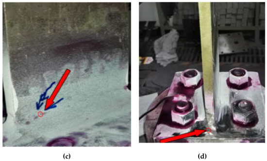 Cracks locations on T-type welded metallic plate (a) at upper welding toe (b) near the edge corner (c) on the weld toe (d) near side edge corner.