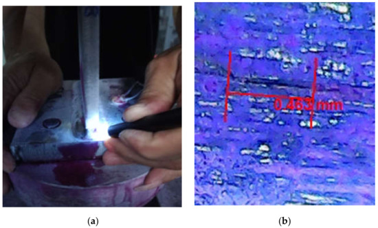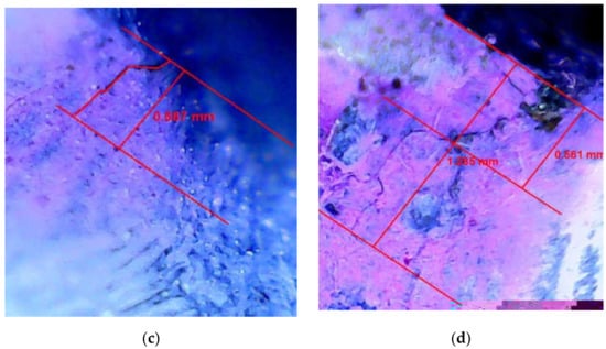 Figure 11a shows the first fatigue crack observed (0.864 mm) during the test, which is a linear crack. As the fatigue loading continues, the crack expands in a linear shape, and new cracks are also generated, as shown in Figure 11b.