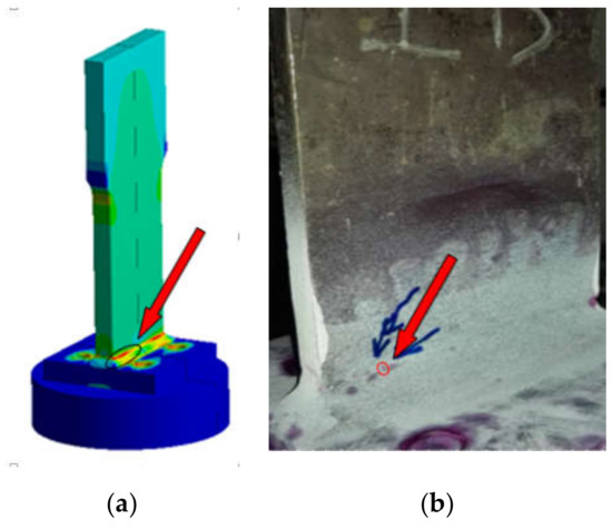 Due to the fluctuation of the fatigue life observed in the tests, the average fatigue life is selected in this paper. The available fatigue life of welded metallic plate joint is 16,402 times. As shown in Figure 6, the fatigue cracks of T-type plate joint often occur in the weld toe area on the joint connection part. The damage location of the weld toe is more concentrated in the location near the edge of the side corner. It can be seen that fatigue crack damage is prone to be shown in the upper welding toe of the joint connection weld, especially the area near the edge corner, which should also be the focus in the engineering practice.
