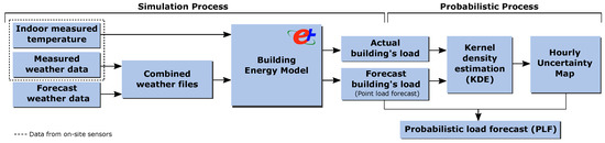 This section explains the methodology to obtain probabilistic load forecasts taking into account the weather forecast uncertainty and using BEMs, which was previously published by the authors in [53]. The technique requires two procedures: the simulation process to determine the historical impact of the weather forecast data on the load provided by the BEM and the probabilistic processing of the simulation outputs. Figure 1 shows the overall schema of the probabilistic load forecasting methodology.