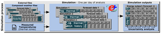 For each day of analysis, one simulation is performed, which is configured to run 15 days before the baseline day (Day 0) with the measured weather data to ensure that the thermal history of the building is captured. The loads on Day 0 and n days of the forecast are obtained as the outputs of each simulation. These results (ordered and classified) are subsequently used in the probabilistic process. The simulation process, the inputs (weather and measured temperature file), and the simulation period are explained in Figure 2.
