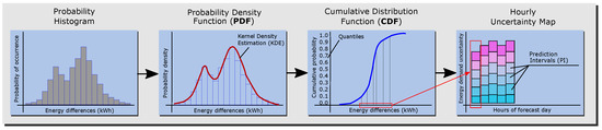 The second procedure of the PLF technique employed is the probabilistic processing of the point forecasts, which are the simulation outputs obtained from the BEM. First, the distribution of the residuals, which are the energy load differences provided by the BEM when it is fed the observed and forecast weather data, is studied through a probabilistic histogram. Second, to obtain a smooth curve that represents the data, a probability density estimation is performed using the Gaussian kernel density estimate (KDE). The objective of this procedure is to obtain the expected probability that the load forecast error is below a certain value. The cumulative distribution function (CDF) or S-curve is employed to represent the probability that the variable (here, the load forecast error due to the weather forecast) will be less than or equal to a certain value. Finally, from the CDF plot of each forecast hour, prediction intervals (PIs) of load forecast errors are extracted and transformed into an hourly map of uncertainty. The schema in Figure 3 shows the complete process.