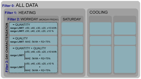 The first step is to define which are the characterization criteria when selecting the training days of the PLF. The key of the proposed methodology is that the selection of the data used for the generation of the uncertainty map and the PLF results is based on a daily unit and not on the seasonality of the data. The use of the seasonal or monthly criteria is discarded since it might happen that different days from different seasons cause a similar energy demand in the building regardless of the season or month in which they belong or that in a given month or season might be days with different behaviors that are negatively affecting the uncertainty map and PLF results. This methodology selects for each day of study similar days from the database attending to its energy demand. In order to characterize the days of the database and find the best set of training days for each day of study, four filters of selection criteria were established. These filters are ordered from highest to lowest filtrate grain, and one filter includes the previous one; in other words, they are cumulative. The schema of the proposed filters and the day characterization are shown in Figure 4.