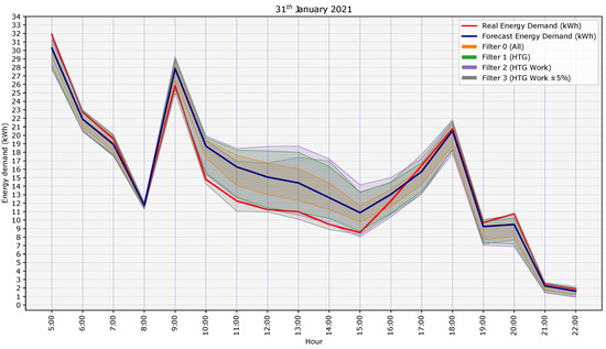 In order to show graphically how the prediction of the building’s energy demand improved as the characterization of the day was adjusted using similar training days to the day of study, a graph with the results for a day of study is shown in Figure 7. Specifically, we show the last day of the test period, 31 January 2020. The graph shows the real energy demand (red line), the forecast energy demand provided by the model using the weather forecast (blue line), and the probabilistic load forecast for each filter. It was observed how as the characterization of the days was adjusted and the filter more accurate (from Filter 0 in orange shadow to Filter 3 in grey shadow), the PLF adapted better to the real energy demand curve, since the shadow of the prediction intervals better covered the real energy demand. Applying the criterion of Filter 3, where the similarity of the energy demand was applied, means significantly improving the PLF. For the day presented in the graph, the PICP values increased from 12.5% for Filter 0 (All) to 87.5% for Filter 3 (HTG-Work±5%) (see the results in Table 6). The better adjustment of the PLF to the real energy demand can be seen graphically especially between Hours 10 and 12, when the real energy demand only fell within the PLF range obtained with the criterion of Filter 3.