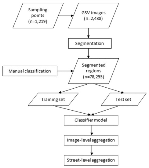 Out of the 2000 sample points, GSV images were available at 1632 points. In addition, we removed invalid points where we did not need to determine the sidewalk’s presence. We decided to exclude 413 street points located within 50 ft of street intersections because they legitimately have no sidewalks. At each point, the left and the right side of eye-level street images were obtained using GSV Static API [13]. Using the street azimuth information, we were able to specify the left and the right side of a street point (subtracting or adding 90° to the street’s azimuth). The field of view was set to 120° and image size was set to 640 pixels by 640 pixels. Finally, we have 1219 points, yielding the GSV study sample consisting of 2438 GSV images in the left and right side of their streets. The final sample served to develop an object-based classification algorithm to detect sidewalks. GSV images were obtained within Python 3.7 and street segment azimuth calculation was conducted with PostgreSQL and PostGIS 2.0.