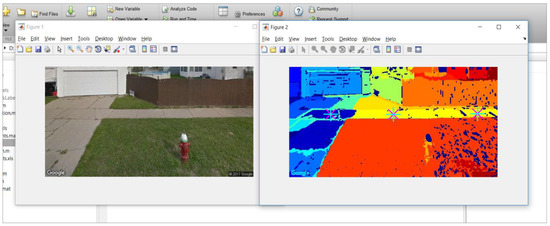 We had two analysts to visually inspect all image regions processed above, to label them as sidewalk or non-sidewalk. A GSV image with a sidewalk region was labeled as a sidewalk GSV image. The manual labeling results served as the ground truth dataset to train and test the classification models explained below. A custom-made interactive tool, using MATLAB, was developed (Figure 2). The tool displays the original GSV image and its segmented image side-by-side. Analysts were trained to point to all sidewalk regions in the given GSV image. Then, the tool labeled the indicated segments as sidewalks and the rest of the segments as non-sidewalks. Figure 2 shows a screen capture of the tool with a GSV example. GSV images with a region labeled as sidewalk were considered as sidewalk GSV images.