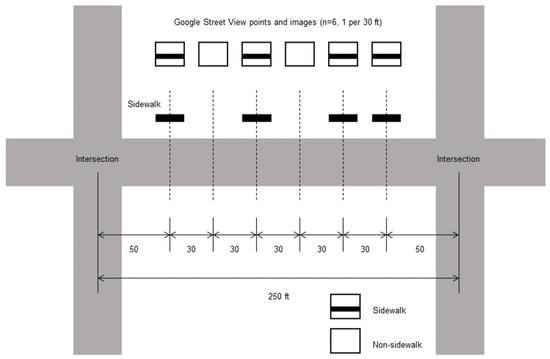 Our aim was to determine sidewalk presence or absence of a side of a street. Potential errors at the image level may be reduced and are aggregated into a larger group, at the street level. For example, a 250-foot street has 6 GSV image points at 30-foot intervals, for one side, excluding two end portions with a 50-foot distance (Figure 3). The image-level classifier developed above determines the sidewalk presence of each of 6 images with an error rate. A street’s side is determined as having sidewalk when half or more of the GSV images are classified as sidewalk images. In the example, 4 out of 6 images are classified as sidewalks, which determines the street as a sidewalk street on the site studied.
